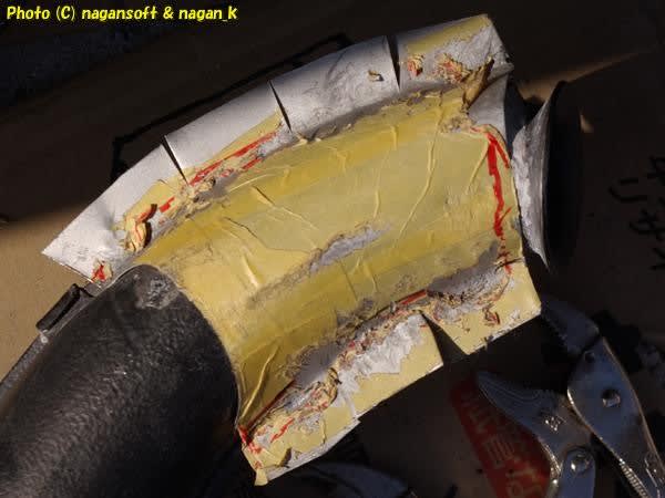 あとは、マフラー鶴首部分に当ててハンマーでシバキ倒すだけです。