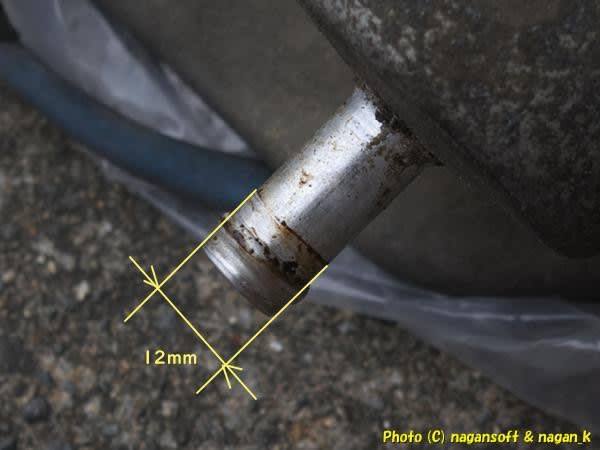 ポンプの差込口の直径を計測します。12mmです。呼び径12mm用のホースですな。となると内径11.5mmぐらいのホースだよね。