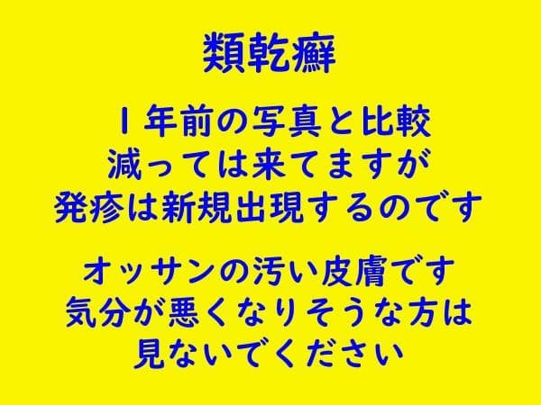 と、ふざけて書いてますが同じような皮膚病を患っている方にしたら、他人の皮膚ってどんな治療でどうなっていったのよって興味あるだろうってのも事実でしょうし、そんな用途で興味ある人がいるのかなー。