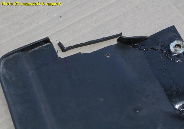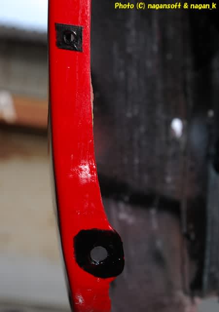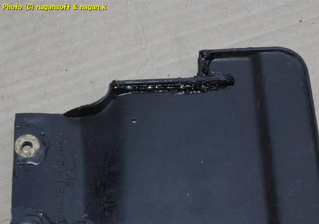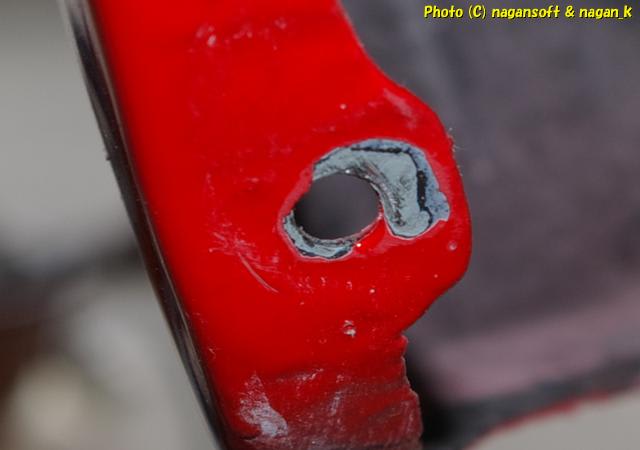 今回のリヤマッドガードを現物合わせで試行錯誤しているときに、一か所に思いっきり工具をぶつけてしまったところがあるのです。それも運の悪いことにボルト通し穴のすぐ傍でして、そこにボルトを通して締め上げたら塗膜が剥がれて….