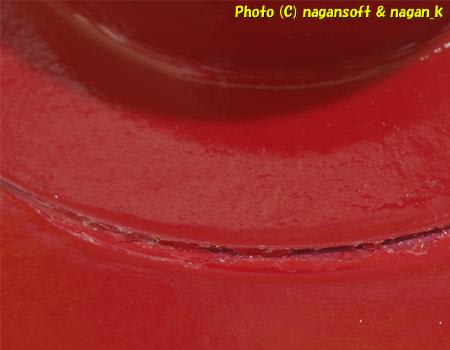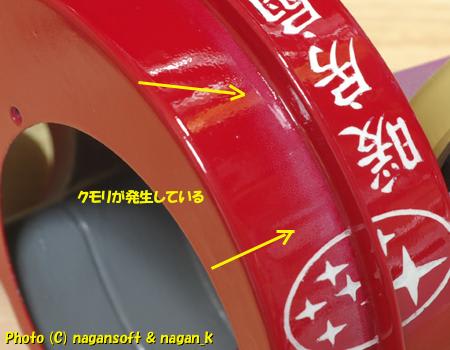 最初は、赤色塗料のせいかと思ったのですが、全体が曇ったのではなく、この合わせの段がある部分にだけ発生しています。