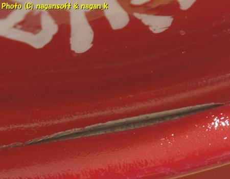 ここは下地の赤は綺麗に残っていて、クリアーだけが膨らんで剥がれています。
