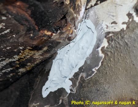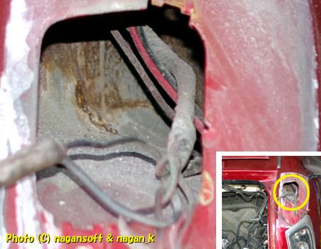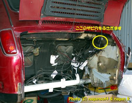 エンジンルーム右側面の上角部分のサビ穴ふさぎです。