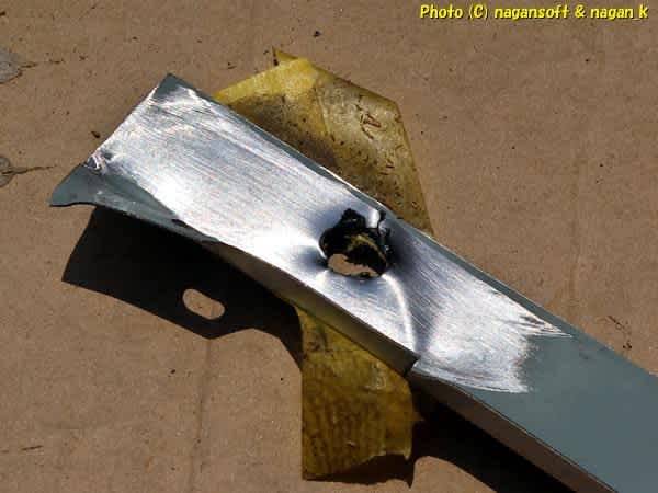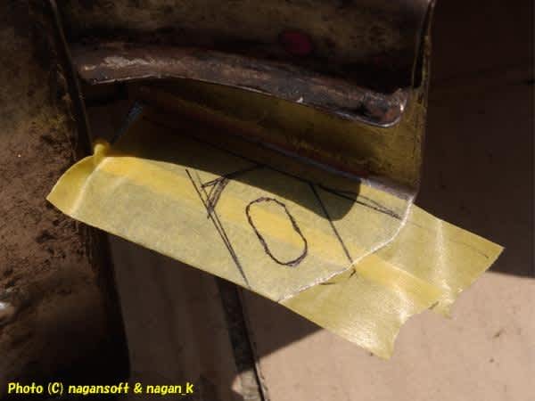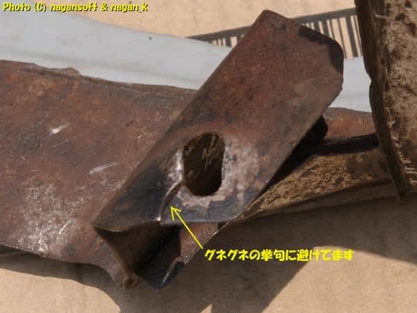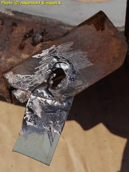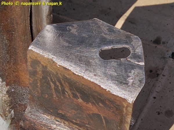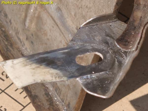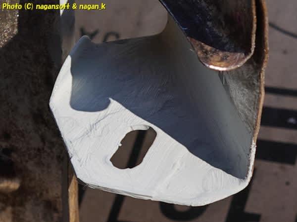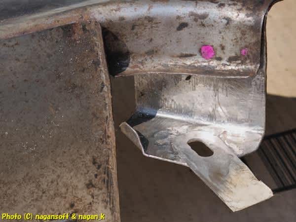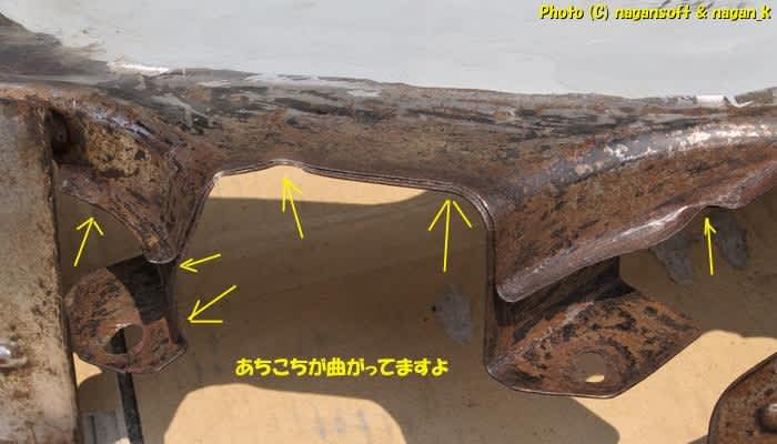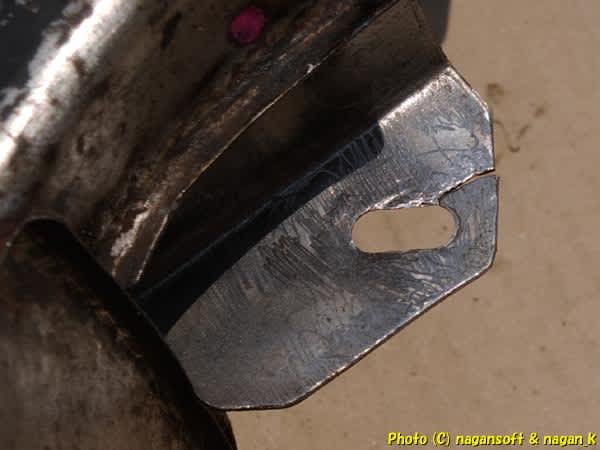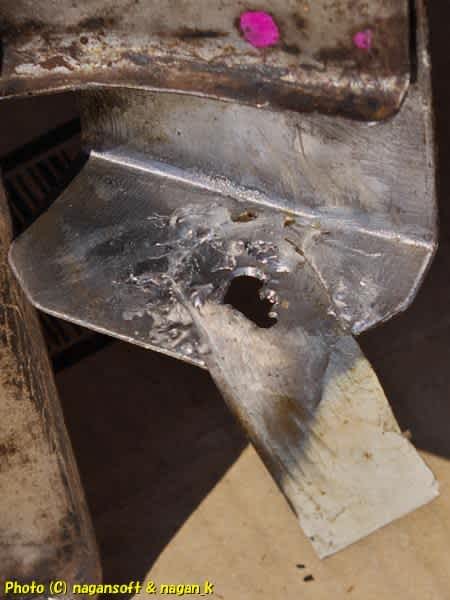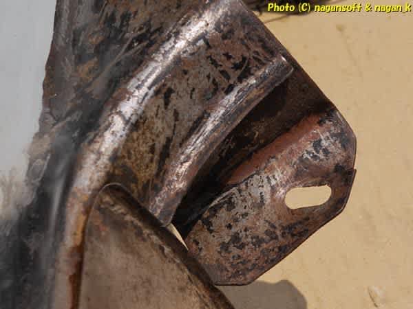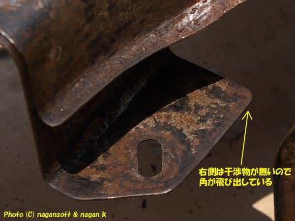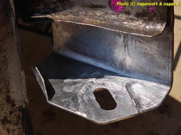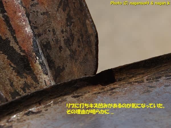 先端マウントの両サイドに立ち上がって貼り付けられている鉄板の縁リブに、あきらかに打ちキズでついたおかしな凹みがあったのよね。