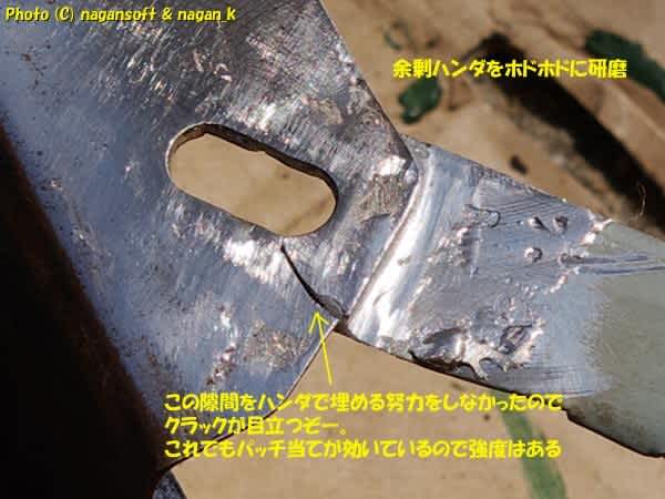 裂傷断面を研磨して鉄肌を綺麗にしていなかったからハンダをはじいてクラックくっきりになってます。