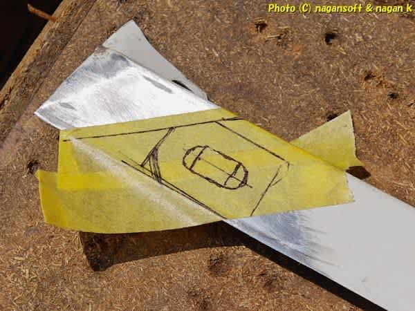 マスキングテープを貼って、その上に落書きしながら貼り込みパッチをデザインします。