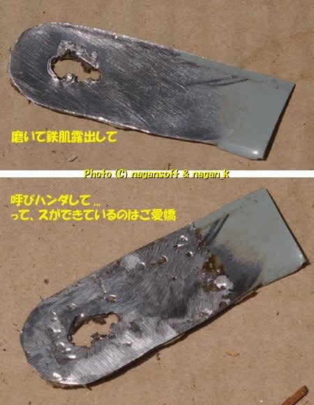 パッチ鉄板を綺麗に研磨して、呼びハンダします。あっ、呼びハンダにスが入っている、まぁーこの程度ならいいやろ。
