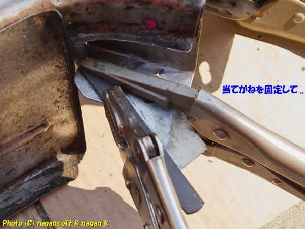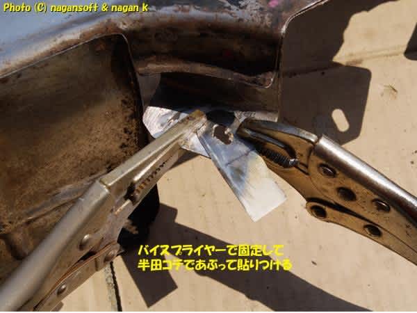 パッチ鉄板を合わせてズレないようにバイスプライヤーで固定します。