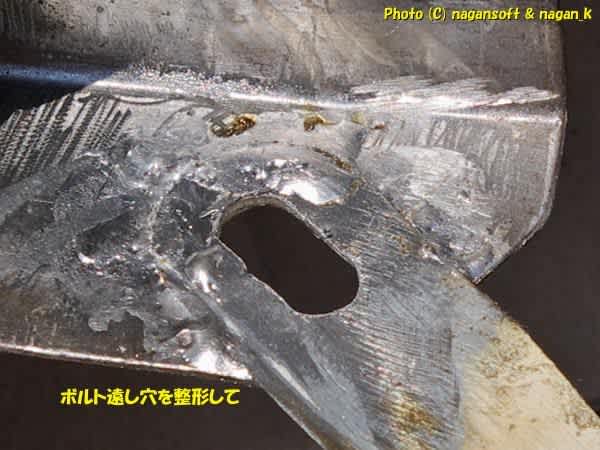 棒ヤスリを突っ込んでボルト通し穴を修正します。