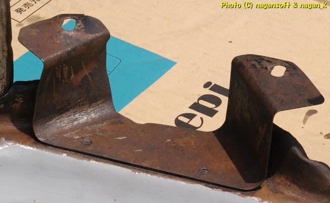 ついては、ブラケットを剥がしてしまって、そうなると、両サイドの垂直に貼り付けられている板部分の錆取りがしやすくなってとかの手順を考えてしまい、垂直板の錆取りを途中で中断して先端ブラケットを弄る気になったのです。