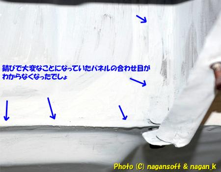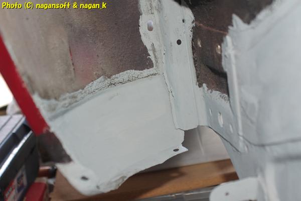 合わせ部分の錆びをほじくり、大穴があいていたところはハンダ鈑金して、そしてボンドでパネル合わせの隙間をふさぎ、サビ止めをしたものです。