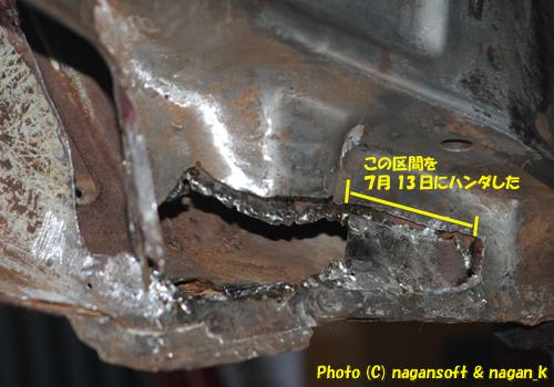 手前側のこんもりと盛っているのがハンダです。丁度、ジャッキポイントの裏側周辺になります。このハンダ肉盛りで鉄板強度を稼ごうという素人考えです。