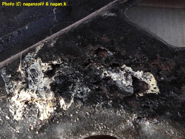 油ギドギトまではいいのですが、えげつなく錆びて大穴貫通。それを痴呆親父が白色のシリコンコーキングのようなもので塞いであるのですが….