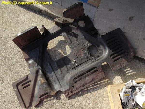 さらに、どうもマフラー側へ伸びるプレート部位が欠損しているみたい。オリジナルの形状がわからないので明断できませんが、錆びて朽ち落ちている箇所があります。朽ち落ち部分直線が10cmほどあるので、その先はそこそこ大きいものと思います。