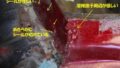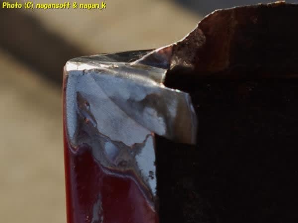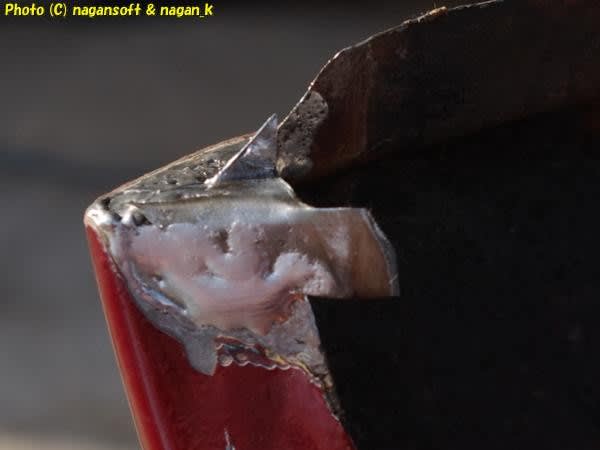 ということは、熱々ハンダが雨粒で一気に冷却と不純物を食らったら、ボコボコの盛り上がり肌になるってことです。ボコボコになるってことは中がなにかしらなっているはずで….。って多分「ス」が入っているんだろうね。