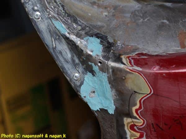 右ヘッドライト枠上部分にパテを盛り付けてます。そのパテをグラインダーでさらりと荒研磨しました。