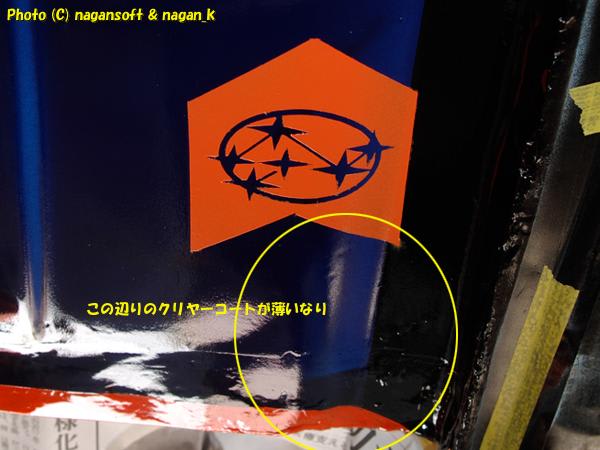 このまま車体下へもぐりこんで、先ほどついで仕事に追加したスバルのマーク部分へ、塗装段差を埋める目的でこってりとクリヤーを筆差ししました。(もちろんクリヤー肌は筆ムラになりますので、後程研ぐことになります)