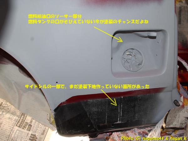 そのすぐ下のサイドシル黒色部位に、まだ塗装下地を仕上げていない場所がありました。単に作業し忘れしております。