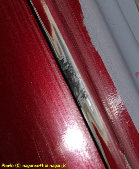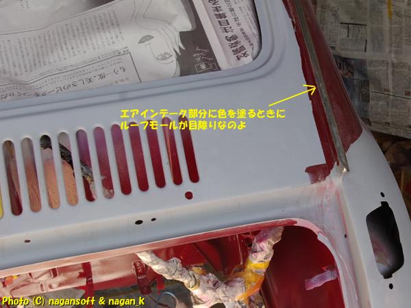 そうかー、ルーフモールを外すとここまで色塗りが可能になるんだなー。と思いながらそのまま下を見ます。