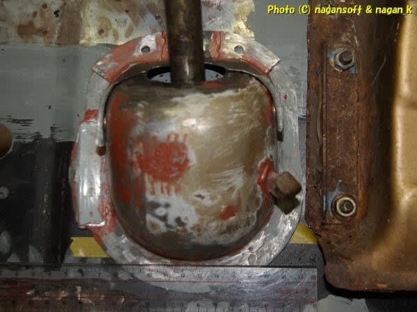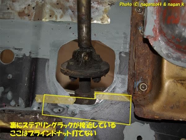 トランク床裏にステアリングラックが貼りついているので、ブランドナット飛び出しがステアリングラックを回避する位置を探らなければなりません。