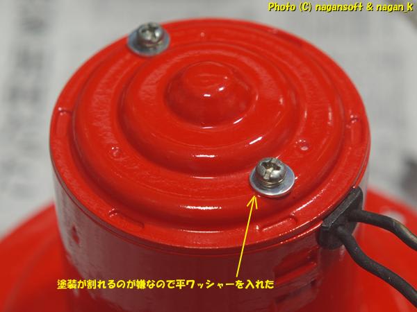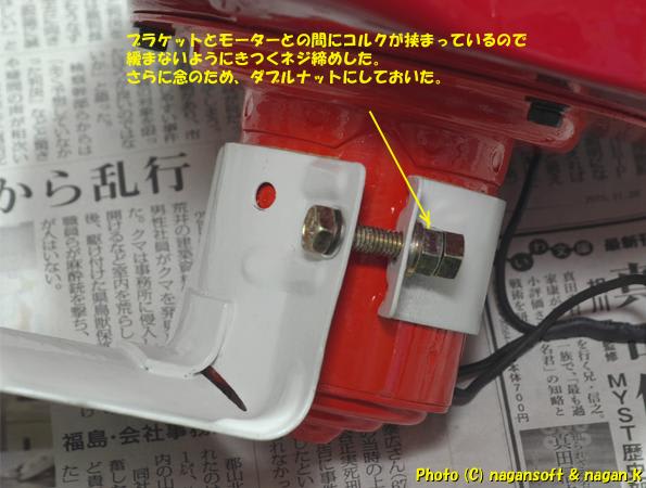 尚、モーターカバーのネジ固定部分が平らではないので、平ワッシャーの端が浮いてますがそんなの気にしないことにします。(平ワッシャーを曲げてフィットさせる甲斐署はありません)
