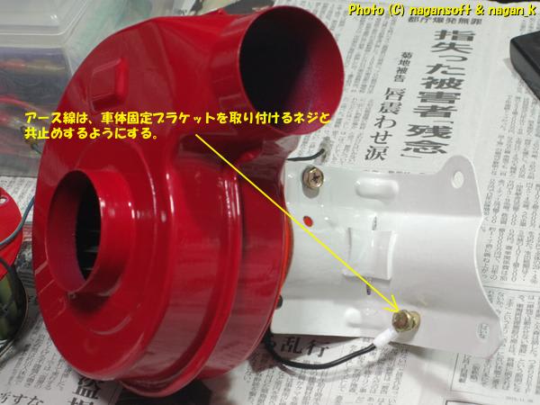 そうではなく、金属部品の中で金属が回転すると、必ず誘導電流が生まれてノイズが出ると思います。そのノイズ対策として、ファンカバーで発生した微弱電流を車体へ逃がす目的で元々のアース線を活用しています。