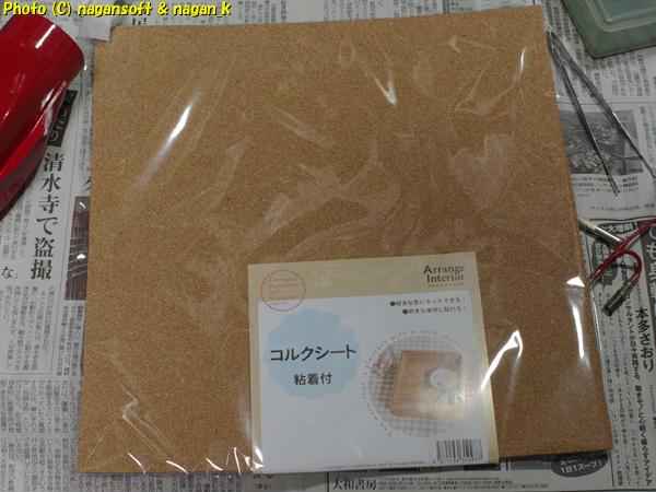 ゴムだと経年で塗装と反応するかなー。とか思いながら、100円ショップで見つけてきたのがコルクシートシールでした。