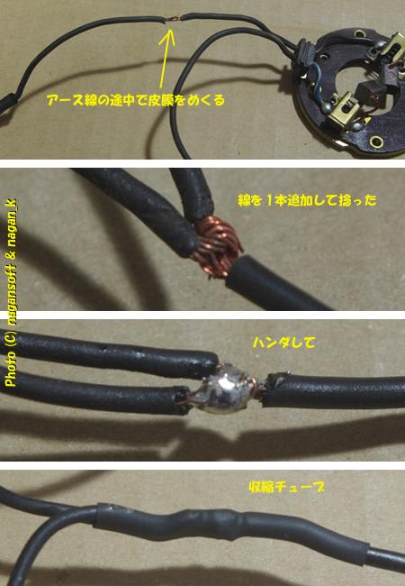 アース線の途中で皮膜をむいて、そこに追加線を割り込ませてねじります。ハンダします。収縮チューブで保護します。という作業です。