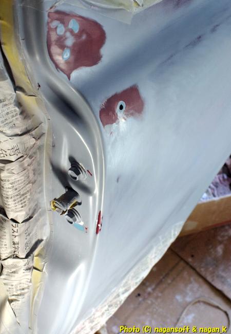 そして、いろいろと後片付けをして、次はテールランプホール部分だねーと確認して、プラサフが蝕指乾燥したタイミングで、ジンクスプレーで膨らんだサイドモール取り付け穴部分の上に念のため薄付けパテをなすくりです。