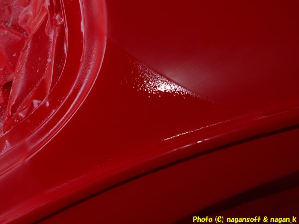 1500番で研いでくすんでいた赤色が、クリヤーがのった瞬間にハッと冴えた赤色に変貌です。