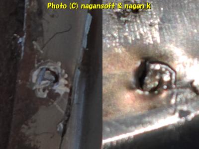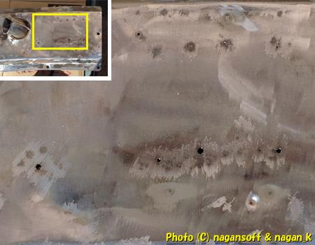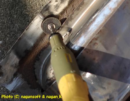 気を取り直して他のところにも、「ポツッ」って感じてリューター先端をあてたら、なんの感触もなく速攻で穴あき。