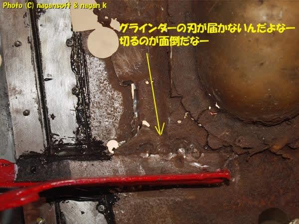 さあー激貧が所有しているチープな電動工具を総動員です。そんな使い方する道具ではないだろうという変体卑怯手をしたりして、車体下から手を伸ばして切り取りました。もちろん顔に錆クズと削り粉に火花を浴びるんです。