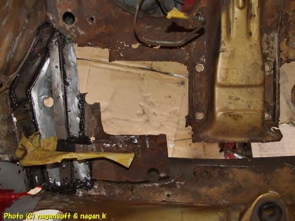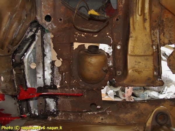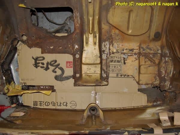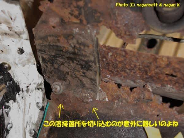 痴呆親父が溶接している箇所を命綱として残しています。運転席床と連結しているのですが、このグダグダな溶接を綺麗に外すのって意外に大変です。