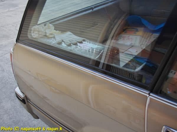 クラゴン君、右リヤクォーターガラス周りの台風被災キズ補修1日目