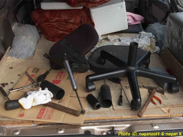 ガレージに、IKEAの椅子と、壊れた事務所の椅子を持っていく。