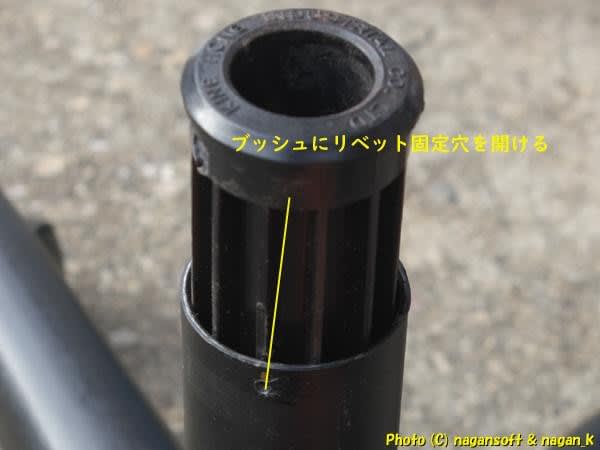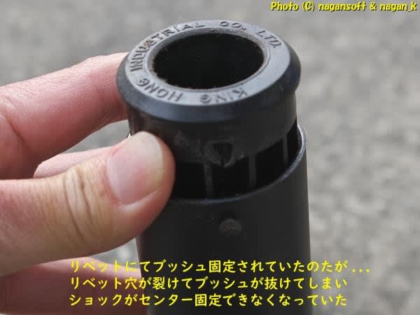 ブッシュはプラ樹脂素材で、そこにリベットを打ち込んでブッシュ固定されていた。