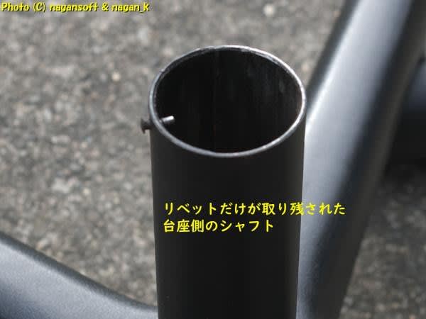 足から伸びている太い金属シャフトにリベット残骸があり。しかし、この金属筒の厚みたるや、今のオフィス家具にこれだけの厚みあるか?