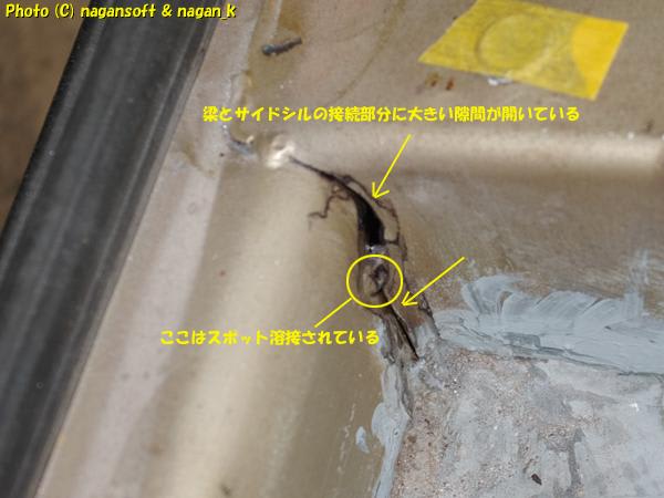 梁とサイドシルとの接続部分に大きい隙間が開いています。