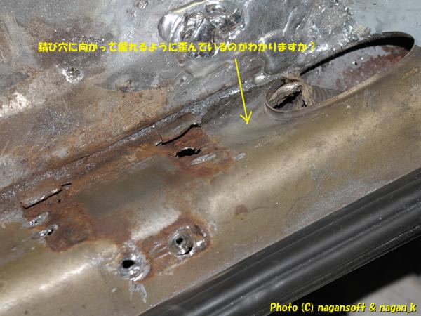 さらに、その裂けている部分から、ヒーターホースのくぐり穴に向かって、サイドシルが歪んでます。