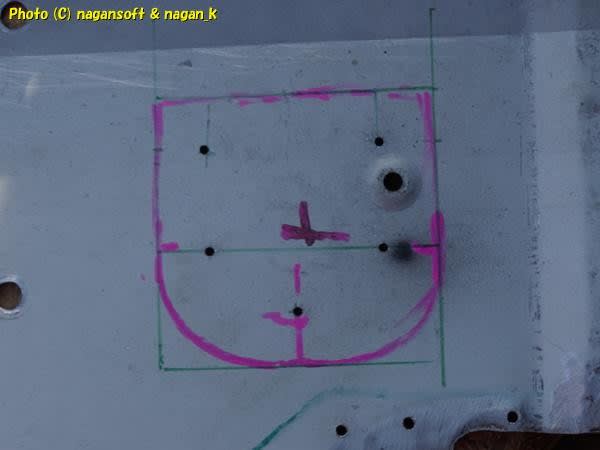 ついで仕事で前日に記しをつけたステアリングラックボルト固定通し穴をドリルで開けました。