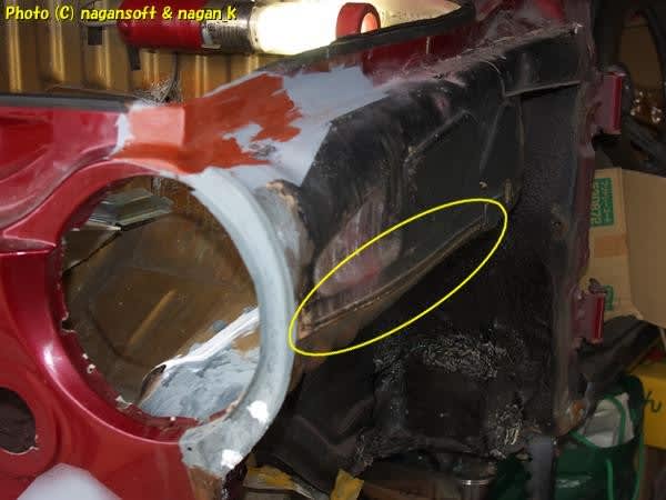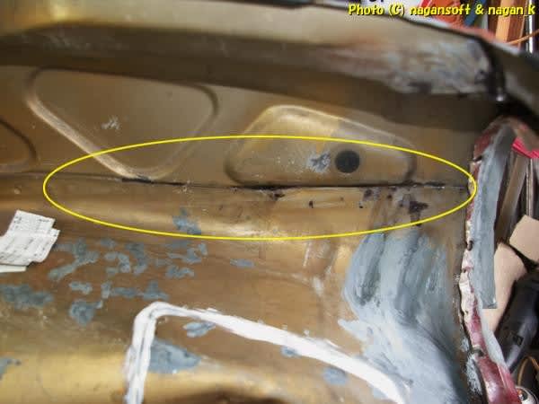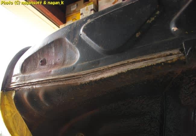 フェンダーエプロンの鉄板継ぎ合わせ部分の錆取り作業をします。
