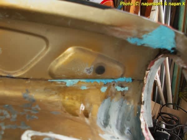 トランク内側の錆穴箇所と鉄板がうねるように凹んでいた箇所はパテをなすくってこんな感じです。