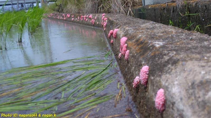 田んぼに沢山ですよ。ジャンボタニシの卵です。