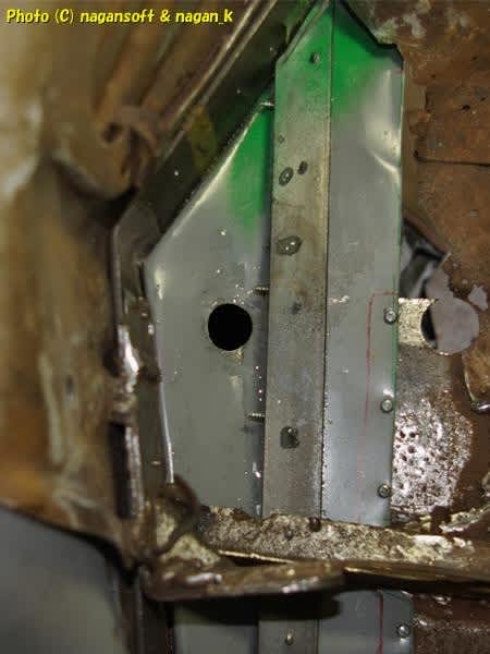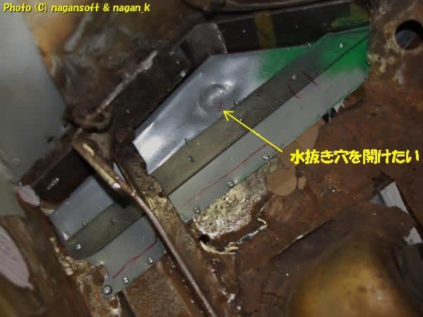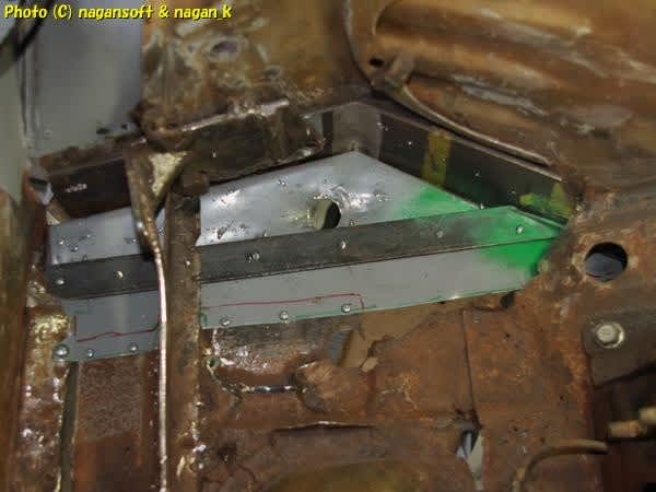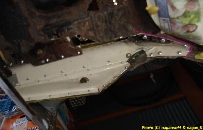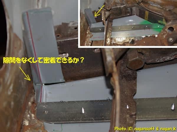 そもそもオリジナルの床鉄板はそんな欲張ったことしないで、下に折ってフロントパネルと接しているだけです。フェンダーエプロン側は別ピースなのよね。