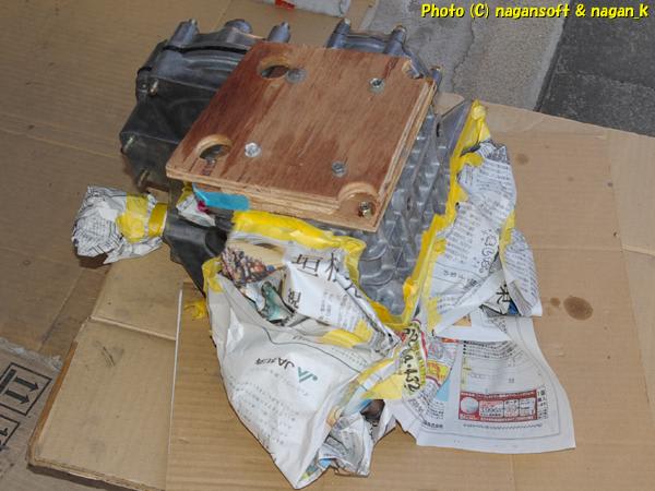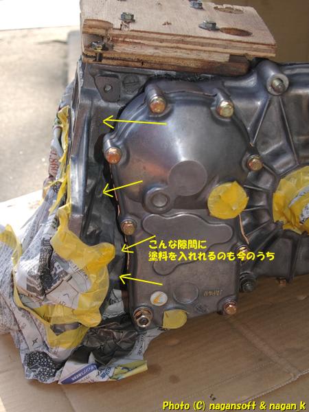 エンジンをひっくり返しまして、噴霧で汚れてほしくないところをチマチマと新聞紙マスキングします。