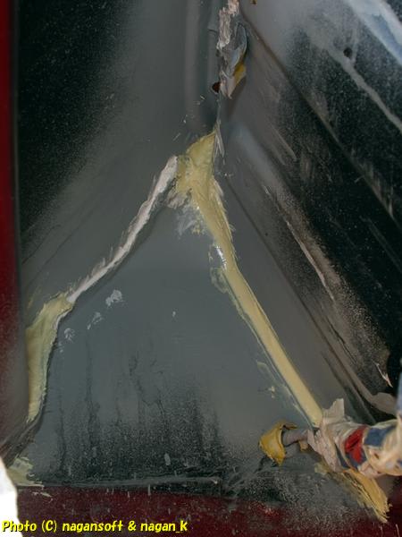 R-2君、リヤガラスはめ合い部–シール処置2日目、エンジンルームエプロンの下側サビ取り2日目