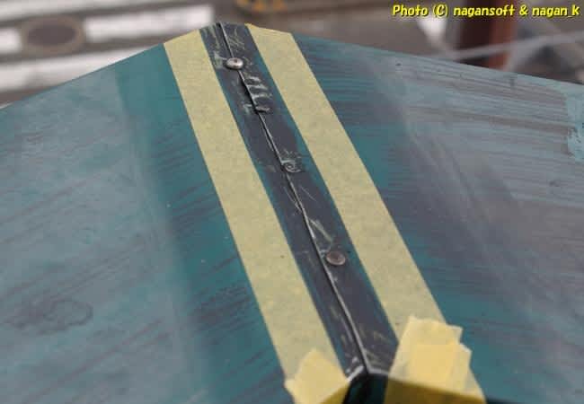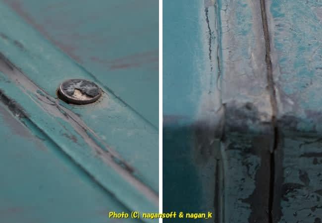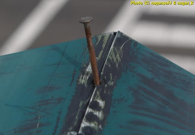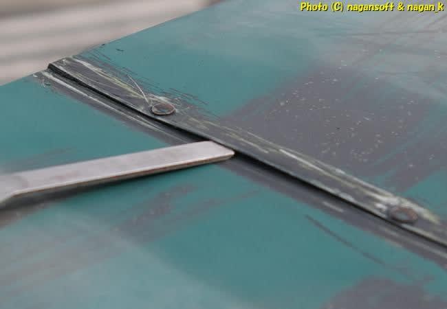鉄板の継ぎ目って、リブ加工されて内側に水が入っていかないようにするものと思っていたのだけど、こいつは被せているだけでなっていないのね。こんな釘打ち固定施工するぐらいだから凝った曲げ加工しているわけないよねー。