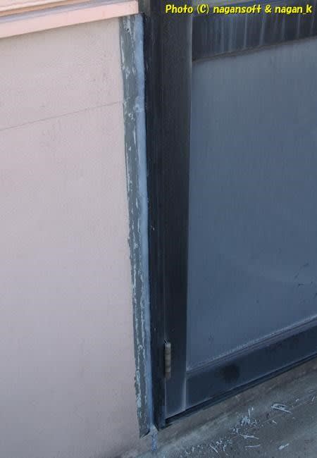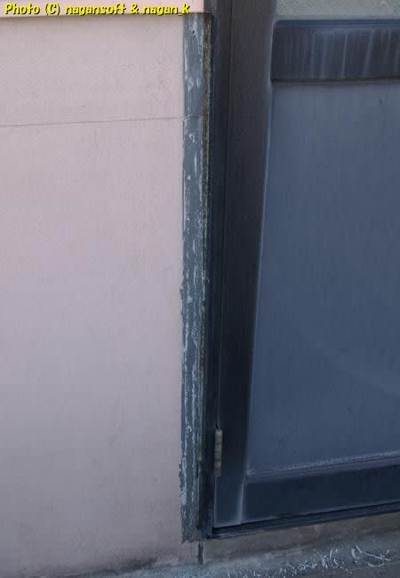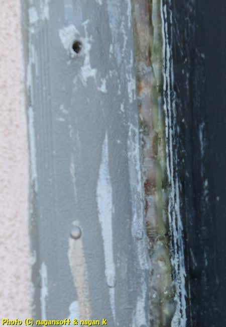 よーく、扉サッシ枠と家の躯体との隙間を凝視します。去年にも隙間にシールはしているのてすが、そのシールがえらく引っ張られて裂けているのを確認です。