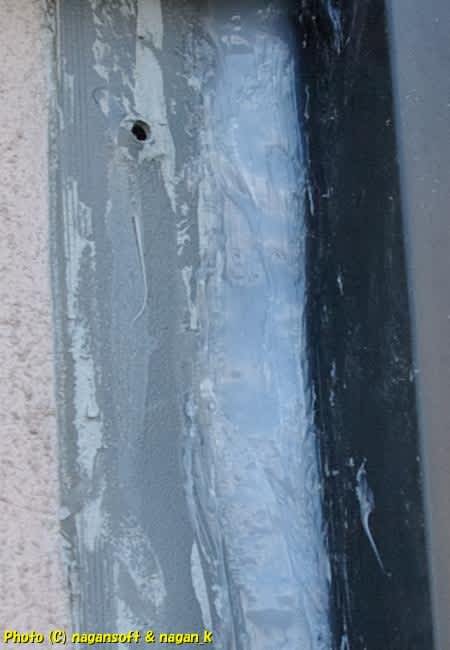 ついては、このボンドのようなものの上にはシールがまったくくいついておらず、サッシと防水シートにシールの端が貼りついているだけでシールがブリッジしていたことになります。