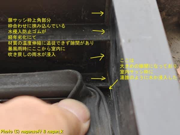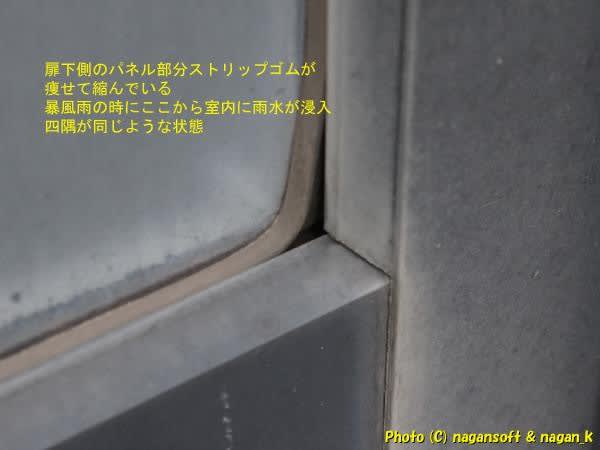 扉下側のパネル部分も同様にウェザーストリップゴムが痩せることで隙間から水が侵入です。